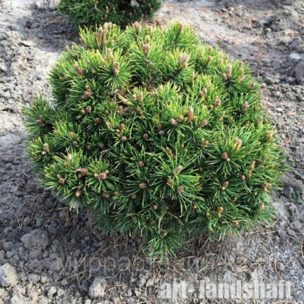 Посадочная яма делается из расчета две высоты и две ширины корневого кома, приобретенного растения. Если почва глинистая, то на глубину ямы необходимо поместить 10-20 см дренажа, например: гравий, керамзит, битый кирпич, щебень. Яму желательно наполнить специальным грунтом для хвойных растений или почвосмесью из расчета 1:2:2 (одна часть земли, две части торфа и две части песка). При посадке в яму можно добавить корневин или любой другой стимулятор корнеобразования, а так же ОМУ (органическое минеральное удобрение) для хвойных растений. Целостность корневого кома без необходимости не нарушать. Расположить саженец необходимо таким образом, чтобы корневая шейка растения не была заглублена. После посадки саженец хорошо поливают и мульчируют корой, щепой, хвойным опадом или опилками. Если в приготовленную почвосмесь не добавлялось ОМУ для хвойных растений, то под мульчу можно заделать в грунт любое минеральное удобрение для хвойный растений. Все карликовые сорта удобряются из расчета 30% от нормы указанной производителем. Сосны привитые на штамб необходимо закрепить на опору чтобы помочь растению противостоять снеговым и ветровым нагрузкам.