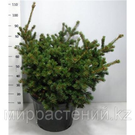 Медленнорастущее дерево с нерегулярной ширококонической формой кроны. Крона часто кустовидная, неправильная, без выраженного лидера с несколько приподнятыми и дугообразно свисающими ветвями.К 10 годам достигает высоты 3–4 метра и диаметра кроны 1– 2 метра. Годовой прирост в высоту 10 см., в ширину – 8 см. Кора в молодом возрасте буроватая, гладкая, позже – красновато-бурая, чешуйчато-шероховатая. Хвоя игловидная, четырехгранная, остроконечная, длиной 1 – 2 см., толщиной – 0,1 см., темно-зеленая. Сохраняется на ветвях 6 – 12 лет. Цветет в мае. Во время цветения мужские колоски красновато-желтые, женские шишечки ярко пурпурные. Семенные шишки цилиндрические, крупные. Незрелые семенные шишки яркие, красные; зрелые – светло бурые, свисающие вниз. Шишки расположены на концах ветвей. Часто виден постепенный переход от хвоинок к чешуйкам шишки.