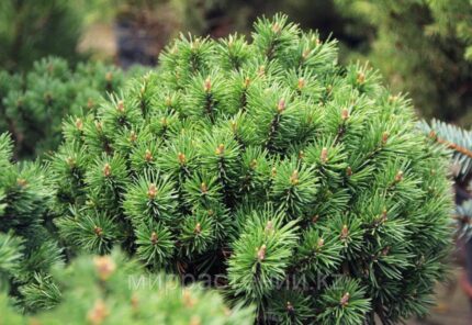 Сосна горная Мопс (Pinus mugo Mops) — карликовая закругленная форма, одинаковой ширины и высоты. Высота — 1,5 м и такого же диаметра. Побеги очень короткие. Почки расположены плотно, различной величины, 1 — 2 см длиной, тонкие, коричневые, смолистые. Крона шаровидная. Хвоя на молодых побегах почти прямая, 2 — 4,5 см длиной и до 2 мм шириной, темно-зеленая. Растет медленно и очень густо ветвится. Размножают прививкой.